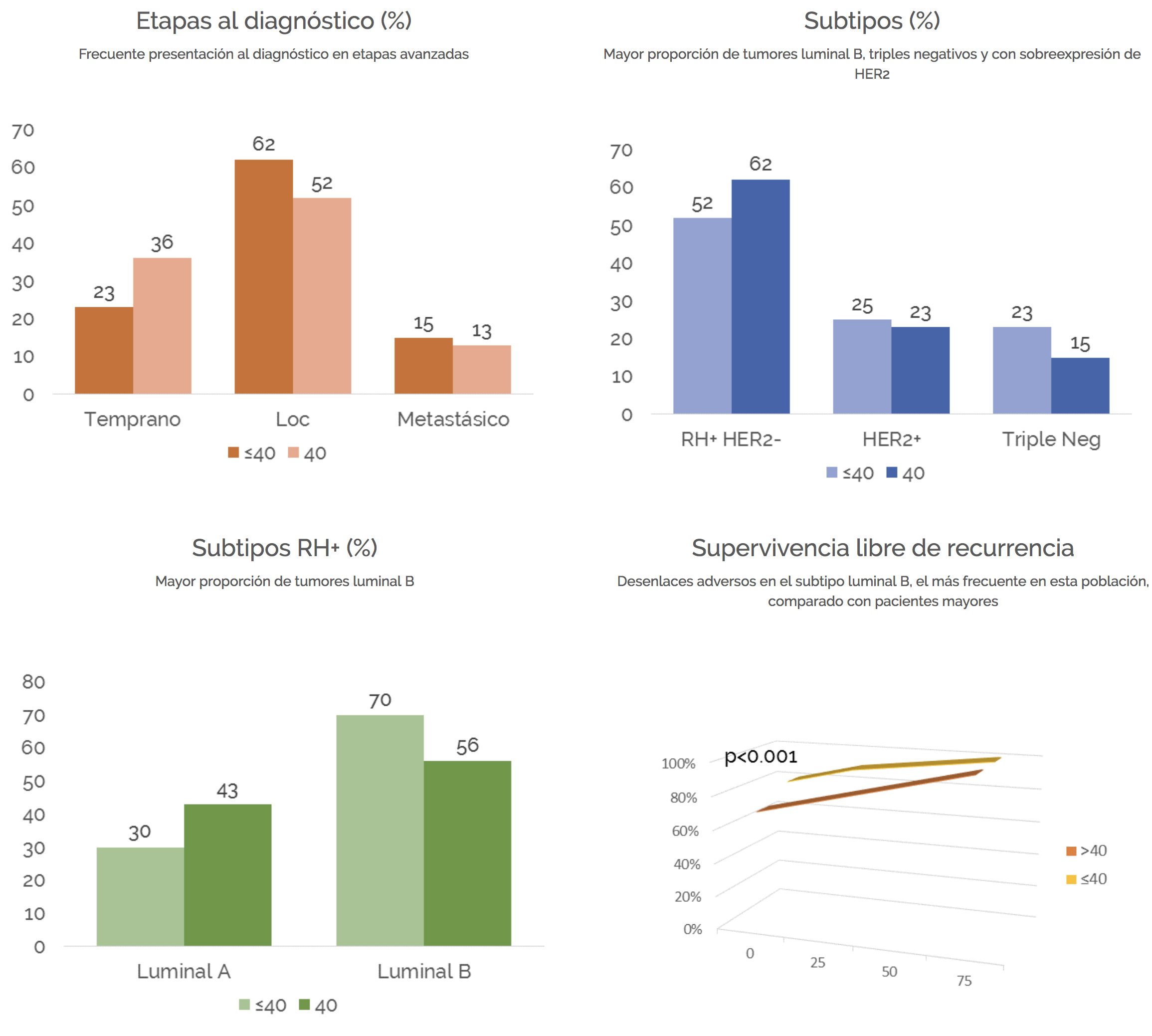 - Se debe considerar que las mujeres con Cáncer de Mama se diagnostican en etapas más avanzadas y que presentan con más frecuencia tumores con fenotipos más agresivos (luminal B, triple negativo, HER2 positivo).
