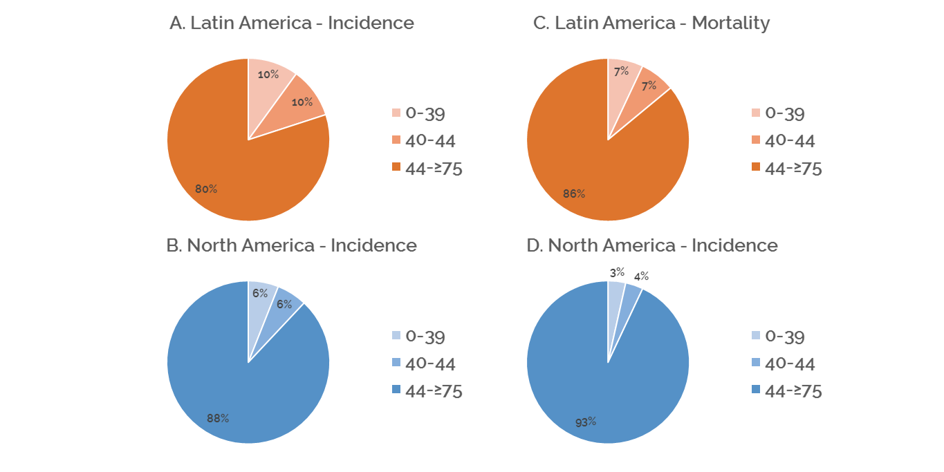 Incidencia de Cáncer de Mama por grupo de edad en América Latina (A) y América del Norte (B) y Mortalidad por Cáncer de Mama por grupo de edad en América Latina (C) y América del Norte (D). Ref.: Oncologist 18(12): 1298-1306.
