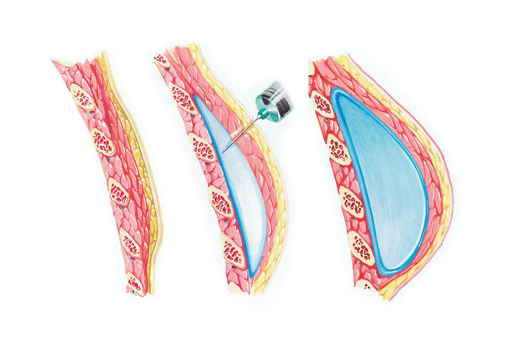 - La colocación de unos dispositivos, conocidos como expansores, que se colocan por debajo de la piel y se inyectan con agua para estirar la piel y poder colocar después una prótesis (implante).