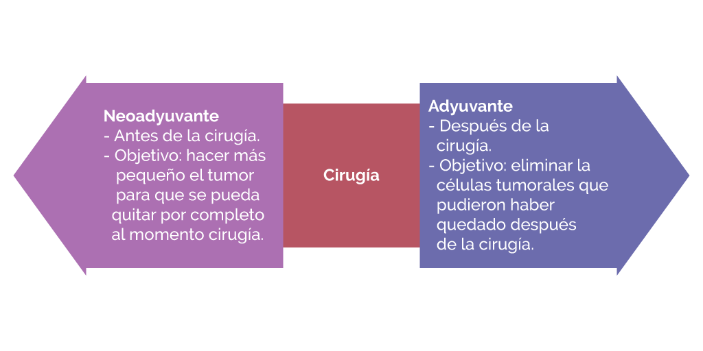 Según el momento en el que se aplica la quimioterapia se le denomina neoadyuvante o adyuvante.